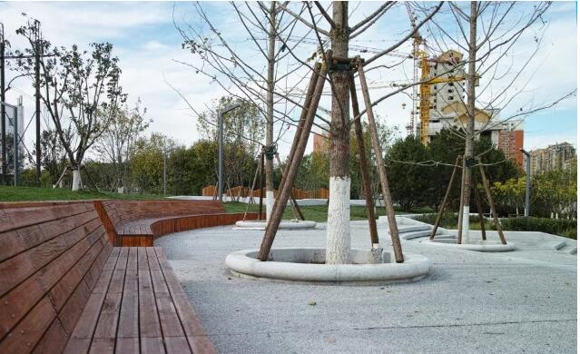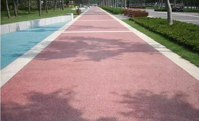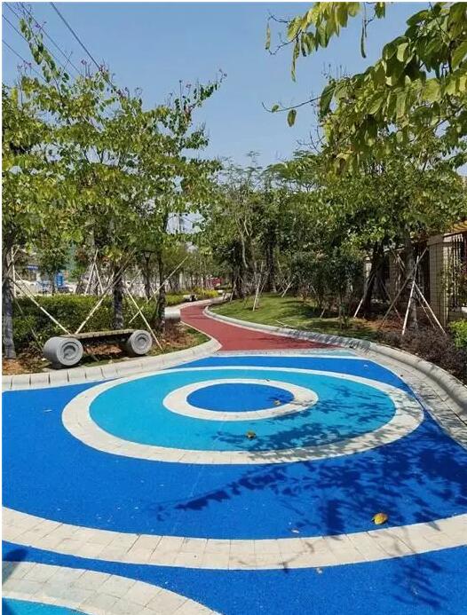 彩石透水材料及透水塑膠的透水系數(shù)極高,往往是透水瀝青混合料及透水水泥混凝土的數(shù)十倍,但也容易出現(xiàn)脫膠、破損等現(xiàn)象,耐磨性較差,因此常將它們用于方便維護(hù)的特殊人行鋪裝,如入口節(jié)點(diǎn)、建筑附屬場地、兒童活動場地、靠近建筑或出入口的主要園路等。