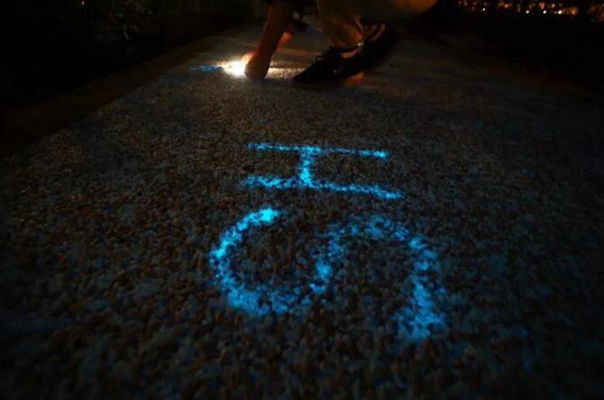 也有不少人選擇自己動手在發(fā)光步道上DIY一些有趣的文字和圖案~用手電筒或手機照明等光源當(dāng)“畫筆”,將發(fā)光路面作“畫布”,盡情釋放想象力吧?。≒S:用手電筒照一兩分鐘即可,稍微一照就有效果~)