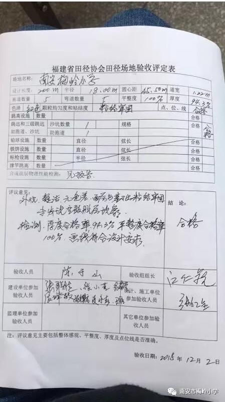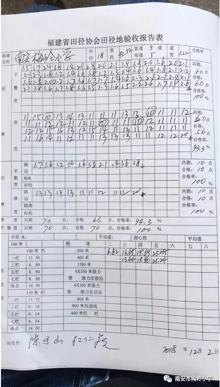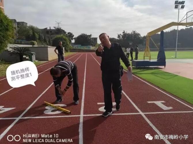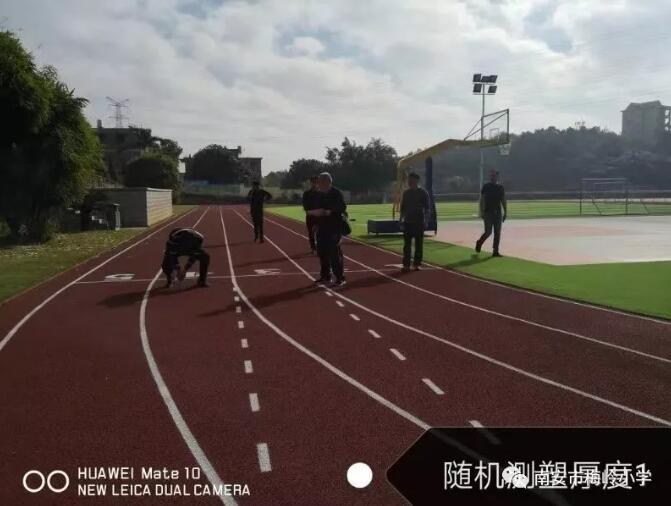 福建省田徑協(xié)會(huì)江處長(zhǎng),陳老師現(xiàn)場(chǎng)驗(yàn)收。跑道厚度測(cè)試60個(gè)點(diǎn),厚度合格56個(gè)點(diǎn),合格率94.3%;平整度測(cè)試60個(gè)點(diǎn),合格60個(gè)點(diǎn),合格率100%;點(diǎn)位線7測(cè)試7個(gè)點(diǎn),合格7個(gè)點(diǎn),合格率100%。