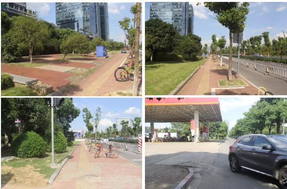 相比艾溪湖北路南側(cè)綠道,置身鬧市的紫陽大道北側(cè)段綠道則面臨著較為局促的發(fā)揮空間。該道路同為南昌高新區(qū)主干道之一,道路環(huán)境則較為復(fù)雜,綠道與大量橫向市政道路和單位出入口相交,路段沿線有大小路口25個之多。