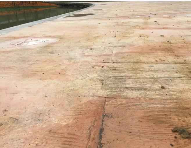 8.上色后的混凝土平整光潔后,印上脫模粉,進(jìn)行花紋成型,模具按設(shè)計要求鋪設(shè)。