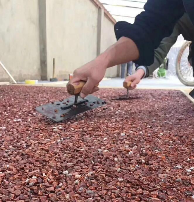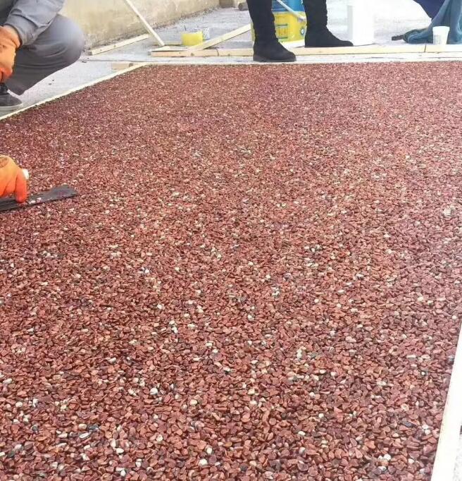 透水膠粘石以改性樹脂膠為粘接劑,各種天然石子、彩砂、彩色石子等)為骨料,加入多種高分子添加劑經(jīng)混拌制成。 彩色透水地坪擁有系列色彩配方,配合設(shè)計的的創(chuàng)意,中間的孔隙無水泥、砂等細(xì)骨料填充,因此為了增加鋪裝強度,必須添加各種性能的專用強化劑。針對不同環(huán)境和個性要求進(jìn)行鋪設(shè)施工。施工人員按照路面地塊、樹池等不同地塊需求進(jìn)行現(xiàn)場鋪設(shè)、安裝,待整個路面鋪設(shè)完畢后覆蓋塑料膜加以保護,并噴上一層保護劑,確保材料徹底變干后顏色能長期保有,同時也可延長路面使用壽命。