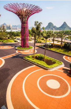 近年來透水鋪裝作為一種主流的鋪裝形式成為城市公共空間的重要組成部分。在進(jìn)行設(shè)計(jì)時(shí),顏色、圖案、功能等元素與不同尺度的空間、小品、建筑、植物等相結(jié)合,創(chuàng)造出豐富多樣的公共空間,為人們帶來不一樣的感受。尤其是色彩和圖案的表現(xiàn)與搭配是環(huán)境主要的造景要素,是心靈表現(xiàn)的一種手段,它能把風(fēng)景強(qiáng)烈地訴諸于情感,從而作用于人的心理。因此在透水混凝土鋪裝的設(shè)計(jì)過程中,色彩和圖案更應(yīng)該和植物、山水、建筑等統(tǒng)一起來,進(jìn)行綜合設(shè)計(jì)。