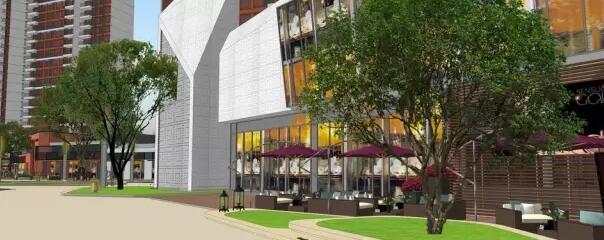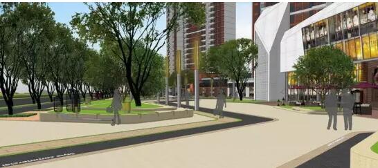 售樓部內(nèi)側(cè)以透水混凝土為主的內(nèi)街街景效果圖——深灰色透水混凝土+米黃色透水混凝土+黃色石材鋪裝與建筑外立面色彩形成豐富的色彩界面