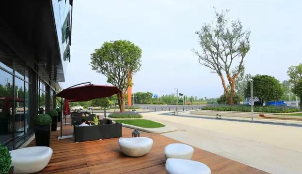 部外部實(shí)景圖——由近及遠(yuǎn)鋪裝材質(zhì)依次為木、石材、透水混凝土,層次分明,舒適的洽談空間加入室外軟裝布品后,形成精心、雅致的室外空間