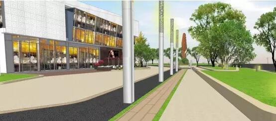 場地主入口效果圖,采用米色及深灰色透水混凝土鋪裝