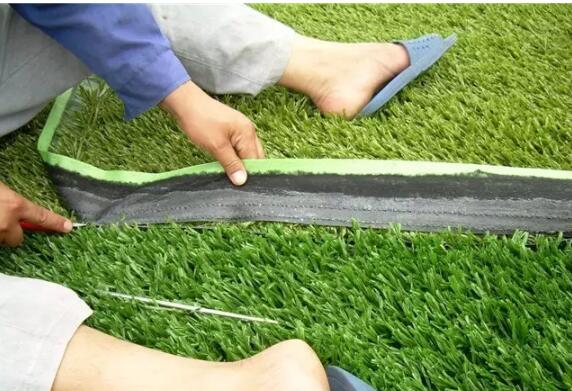 用專用工具按規(guī)格對草坪進(jìn)行切邊,對縫,并用專用接縫膠及接縫帶粘接人工草坪。