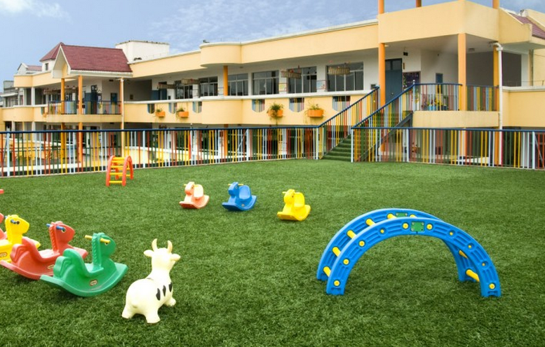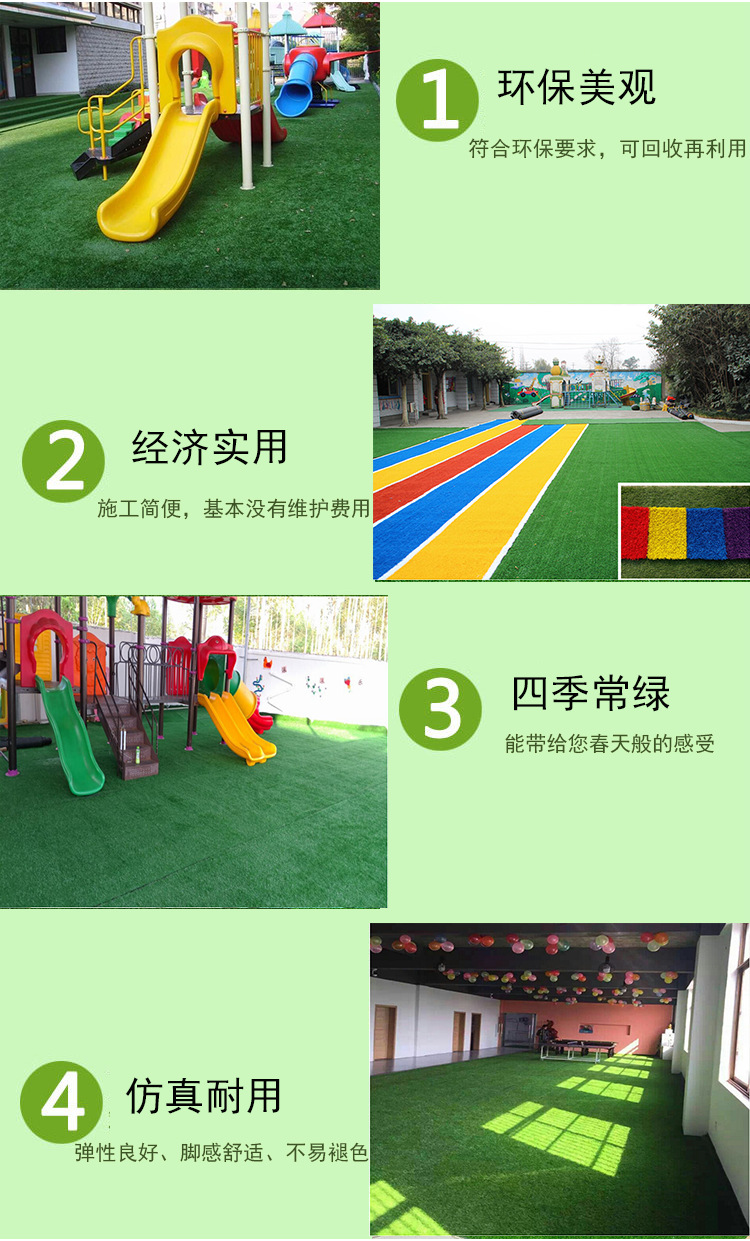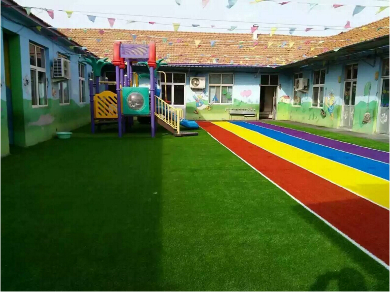 幼兒園人造草坪被廣泛用于幼兒園、以及各類兒童比賽的會(huì)場布置、兒童樂園人造草坪的場地布置