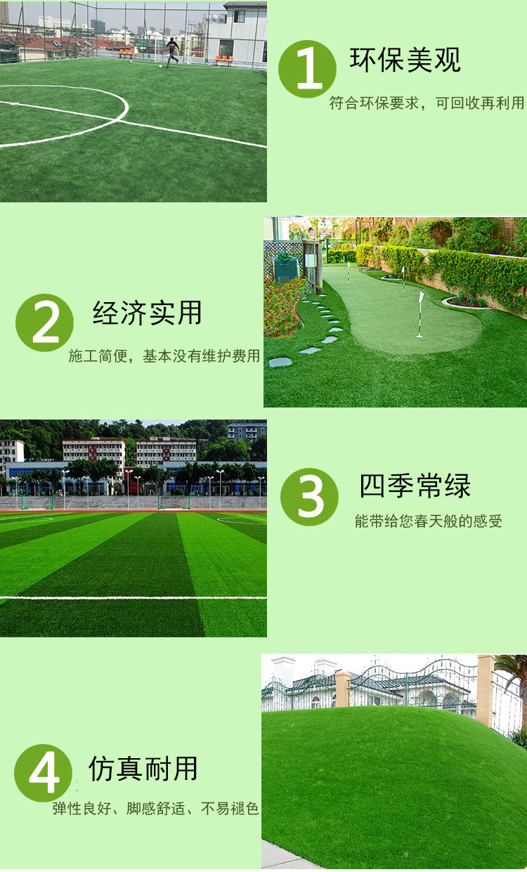 2、人造草坪維護簡單,養(yǎng)護費用低,用清水沖洗即可去除污垢,而且仿紫外線、耐腐蝕、防霉、環(huán)保無污染、不褪色。