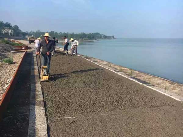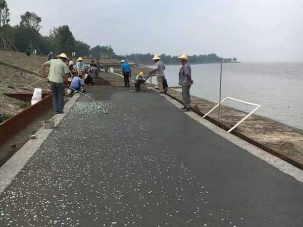 首先攤鋪普通的透水混凝土,將水泥、石子、膠結(jié)劑按照比例攪拌-攤鋪-整平抹光后,將人造夜光石通過人工嵌入混凝土的表面即可,擺放的形態(tài)隨意,最后噴涂罩光保護(hù)面油加強(qiáng)人造夜光石的粘接力和表面耐磨度。